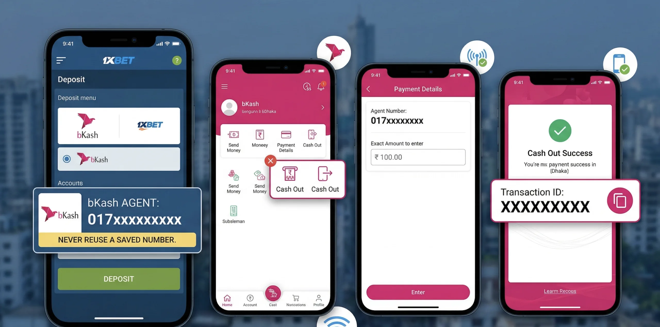 - Open bKash and go to Cash Out. Not Send Money. The number 1xBet gives you is an agent merchant number, and it only accepts Cash Out transactions.